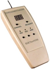 and off, for displaying the vote and for resetting the system for a If the "lockout" mode is activated the vote choices made by each Voting Module can be changed only until the vote has been displayed. Thereafter, they cannot. To cancel this mode follow the directions given in the Programming and Operating Instructions. Also, on the back surface is a six conductor modular jack used for the connection to a desktop printer.