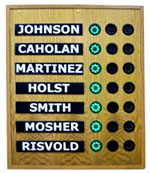 SMALL DISPLAY PANELS The Small Display Panels accommodate nameplates ¾" X 4 ½" and have 1" diameter LED arrays. These panels are suitable for viewing distance of up to 25 feet. Panels are 10" wide, 1 1/4" thick. Heights are, for 5 members -14", 7 members – 16". 9 members – 18", 11 members – 19", 13 members – 19" and for 15 members 21 1/2'". These Panels are frequently used in situations where it is difficult for the voting members to view the primary Display Panels. SET OF INDIVIDUAL VOTE DISPLAY PANELS These Individual Panels - one for each member - are 4" high by 24" wide by 1 1/4" thick with 2" by 12" name plates. They are intended for placement in front of each individual voting member. CUSTOM DISPLAY PANELS can be price quoted for any situation or design concept, special décor or extra long viewing distances.