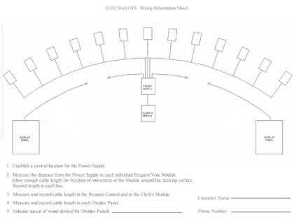 1. Circle the box labeled POWER SUPPLY most closely representing its location. The Power Supply feeds each individual component by a 4-conductor modular cable carrying only 5 volts – no conduit is required. 2. Circle as many VOTING MODULE boxes as ordered, starting with the center one and working right and left. In the box representing each Voting Module, enter the number of feet from the location chosen for the Power Supply to the center of each Voting Module location. Add the footage necessary to accommodate the freedom of movement required to use the Module. 3. In the box labeled CLERK’S MODULE enter the number of feet of cable NEEDED to reach the Power Supply. 4. For each DISPLAY PANEL ordered, determine the number of feet of cable NEEDED to reach the Power Supply and enter in the Display Panel box. Each Display Panel has two jacks at the bottom of the back. If desired, a second and third Panel my be "daisy-chained" from the first Panel. 5. Indicate the choice of wood specie you desire ___________________.